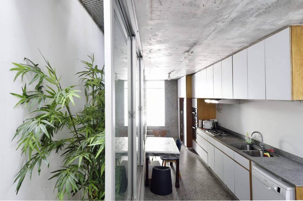 In No. 11, Linghao of Linghao Architects gave the shophouse unit a new rear extension with four floors and connected it to the original three-storey building with an open central courtyard. Thin steel bridges that crisscross the courtyard space join the upper levels of house’s old and new parts. The bridges afford a different view depending on where you stand on them, so there is always an interesting vantage point from which to appreciate glimpses of the house, framed against the backdrop of the city.