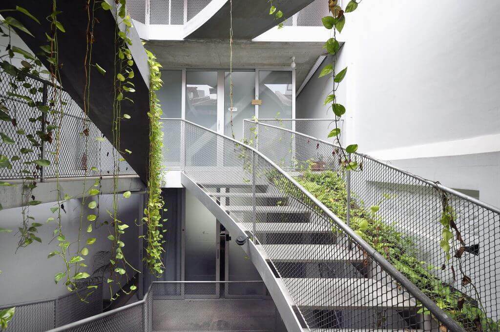 Staircases are often employed as the centrepieces in the homes he designs, so it was perhaps unsurprising that Han Loke Kwang added not just one, but two of them in No. 13. Painted a fiery red, the founder and principal architect of HYLA Architects made the staircases impossible to miss against the white interiors of the house. Suspended over the island kitchen is the first staircase, which links the second storey to the attic. The second, nicknamed the “Red Dragon”, is found in the courtyard and spirals over four floors to link the ground level to the roof terrace.